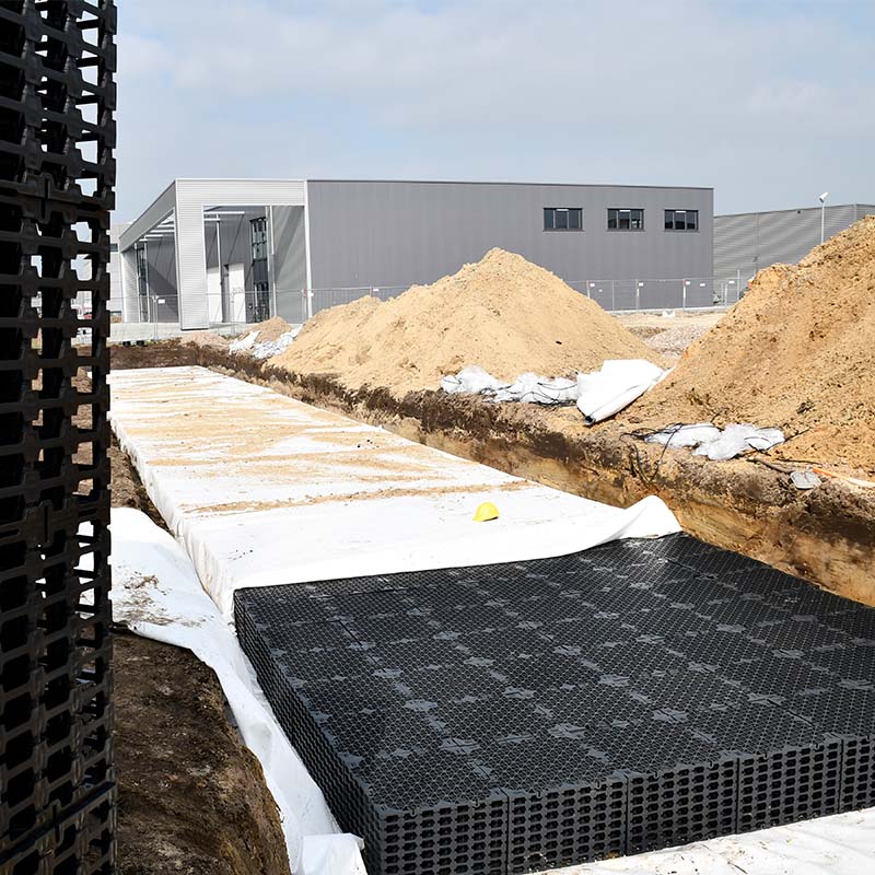 • The infiltration facility is based on the ITPlusVariobox 600x600x400. The 400mm high crate is a good solution here because of the higher groundwater level.