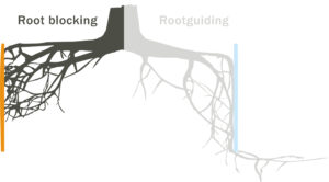 Roots naturally grow from the tree base mostly horizontally and radially. (The myth of deep or shallow rooting trees ) Once arriving at a barrier, roots try to bypass the barrier. After passing, the initial radial growth continues. (Research ........). But if this barrier is applied over a long length or even completely around a tree, passing is impossible. As a result, the tree is restricted in its ability to create sufficient stability roots. (anchor roots) As the tree crown increases, the danger of toppling increases. To prevent stability problems, screens with vertical ribs were tested and developed in the 1980s. The vertical ribs guide the roots downwards. Once under the screen, the roots continue their radial growth at a greater depth. And this ensures the stability of the tree.